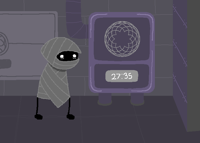| You take a look around the area and take inventory of your surroundings. On the wall to your left is a METAL PANEL with a weird circle dealy in the center, and to the right of that is some sort of METAL BOX with two slight indentations. The upper indentation has the same circle thingy as the panel, and the lower one has an OMINOUS COUNTDOWN, of which you are not certain what it is counting down to. On the wall opposite is a weird TERMINAL with a screen attached. You're not really sure what that does either. To be honest, you really do not care about any of that, and you mostly came down here looking for food. |